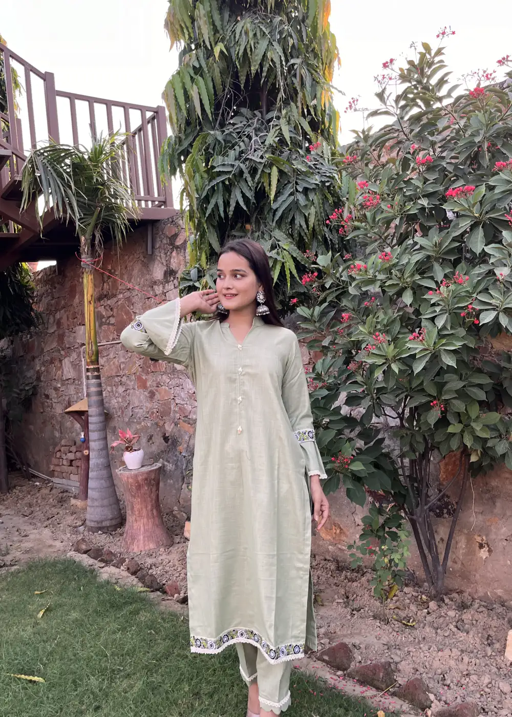 Refresh your wardrobe with this elegant mint-colored linen co-ord set, designed to bring comfort and style together effortlessly. The breathable linen fabric ensures a light, airy feel, perfect for warm weather. The set features a beautifully tailored top and matching pants, both enhanced with delicate bead lace detailing that adds a touch of refinement and grace. Whether you’re dressing up for a casual day out or a relaxed evening gathering, this co-ord set is the perfect blend of modern chic and feminine charm. Versatile, stylish, and comfortable—it’s a must-have for every woman’s wardrobe.